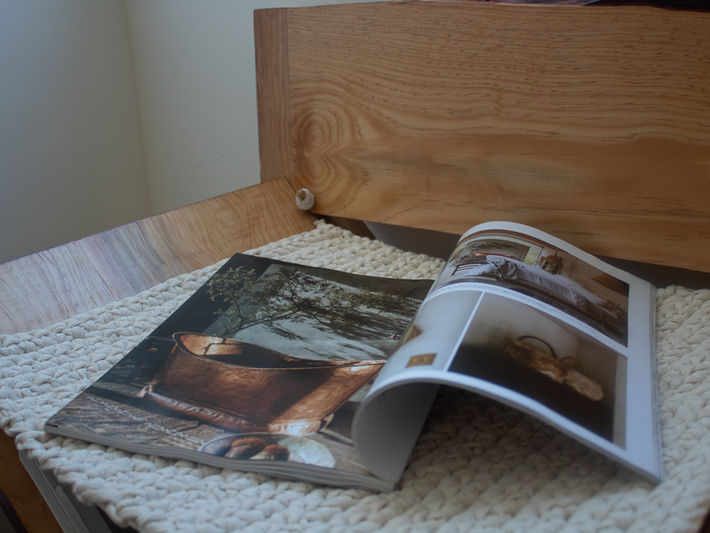 Silla flat pack creada a partir de una tabla de madera de pino (30cm x 122cm x 1”) y soga de nylon.